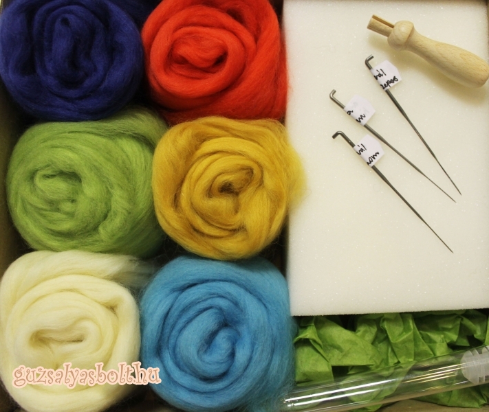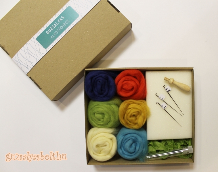 A tűnemezelő alkotódobozban olyan anyagokat és eszközöket találsz, amelyek tűnemezelés technikájával készült nemeztárgyak alkotásához szükségesek.